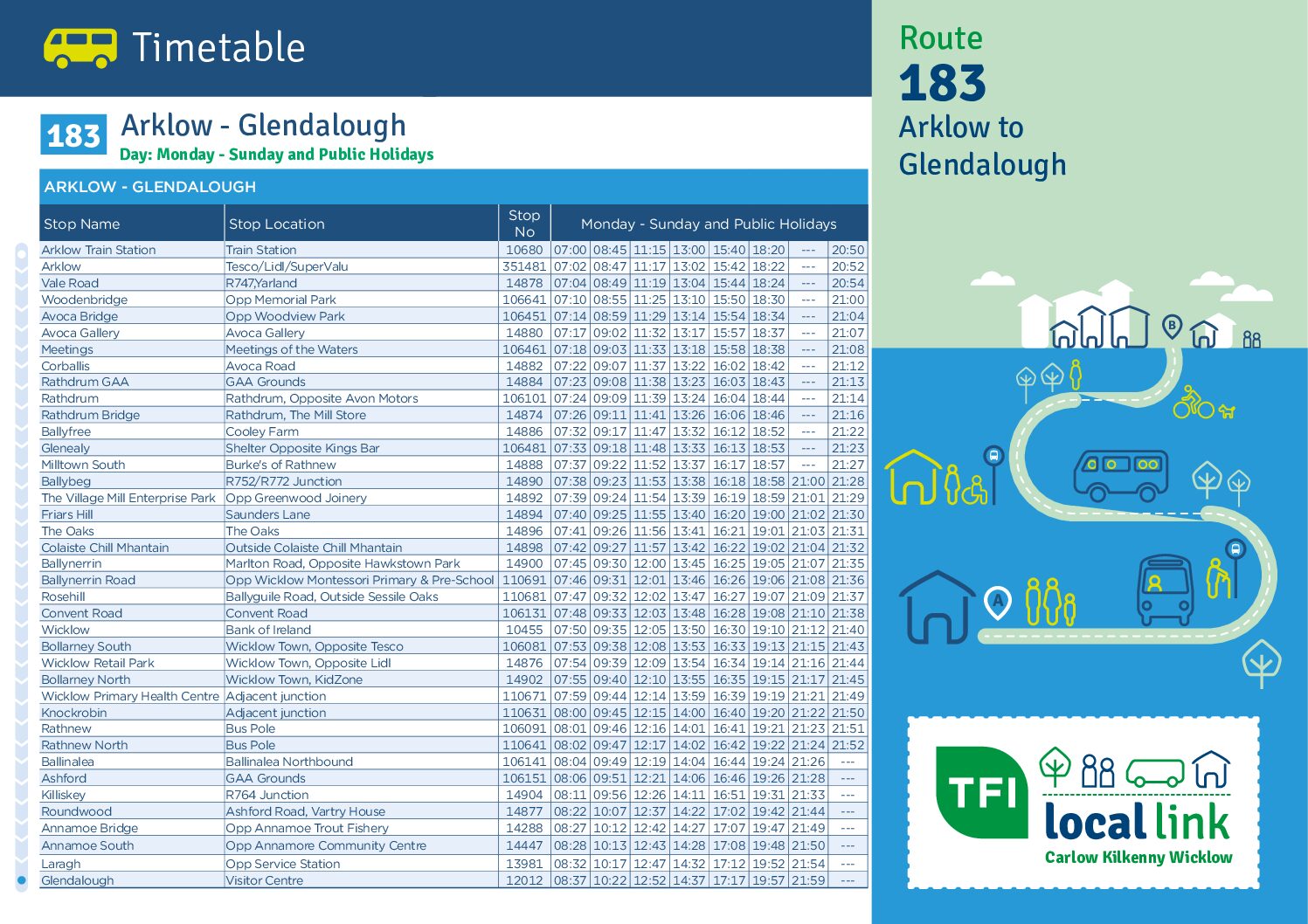 Bus 183 covers Arklow to Glendalough/ Glendalough to Arklow. Please see the timetable below: